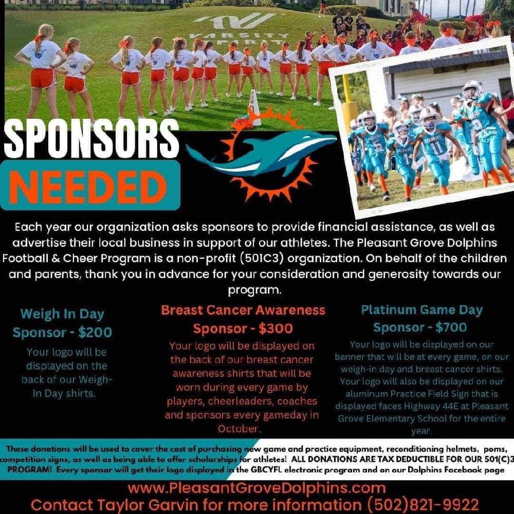 These donations will be used to cover the cost of purchasing new game and practice equipment, reconditioning helmets, poms, competition signs, as well as being able to offer scholarships for athletes! ALL DONATIONS ARE TAX DEDUCTIBLE FOR OUR 501(C) PROGRAM! Every sponsor will get their logo displayed in the GBCYFL electronic program and on our Dolphins Facebook page. On behalf of the children and parents, thank you in advance for your consideration and generosity towards our program.